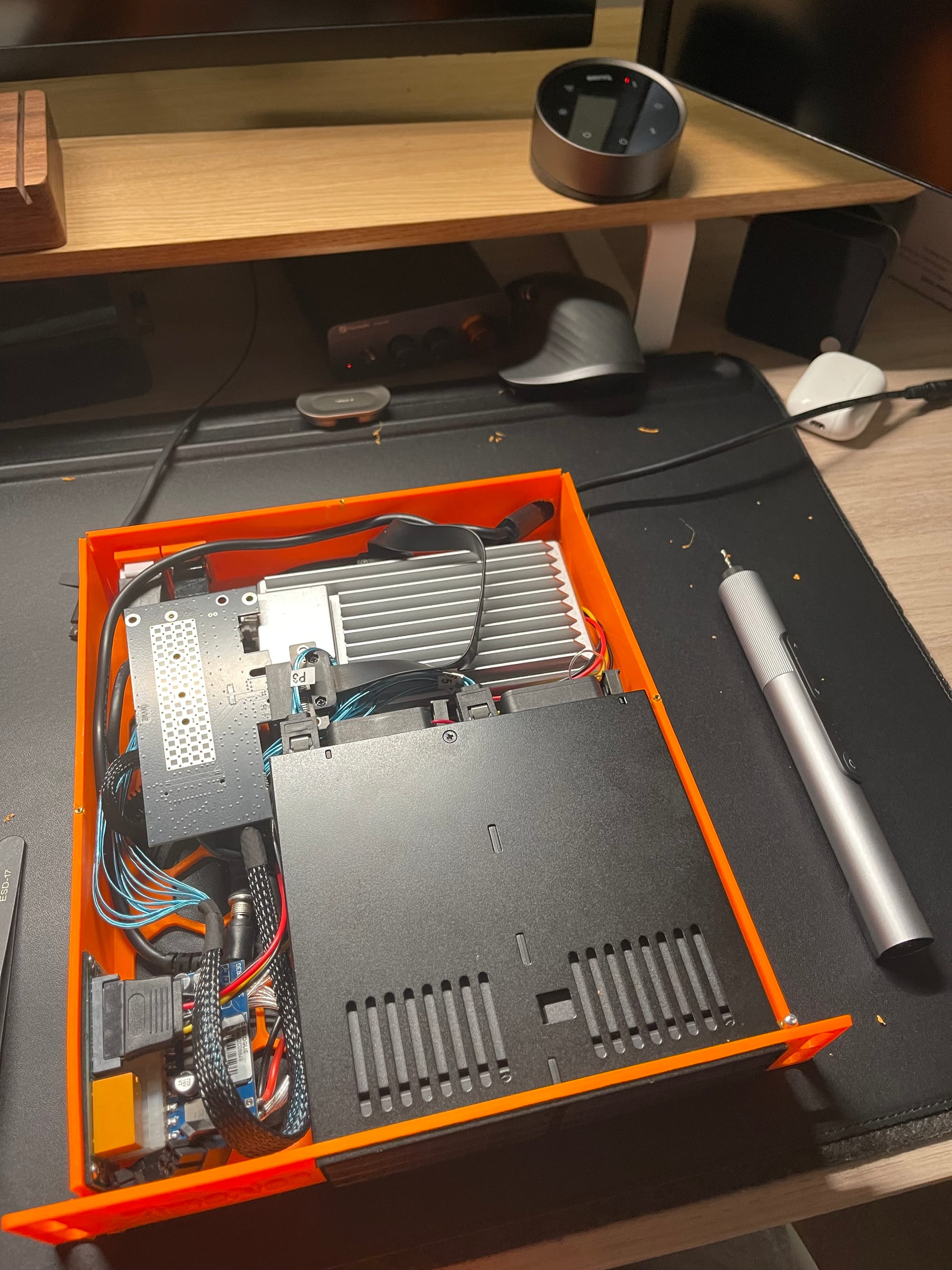 Enclosure assembled. You can see both where the enclosure has warped while printing in the top left corner and where I added some threaded inserts in the top corners to try and seal the lid down.