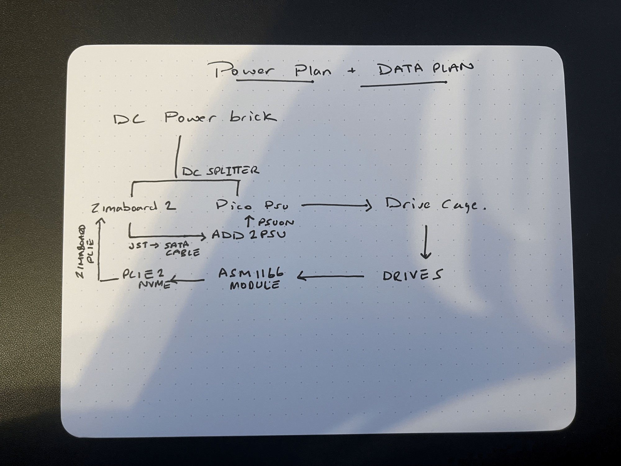 Space constraints ruled out ATX/SFX PSUs so I split compute and storage rails but synchronised their power-up behaviour. This avoided the need for a custom power PCB which would have required modifying the ZimaBoard's internal headers.